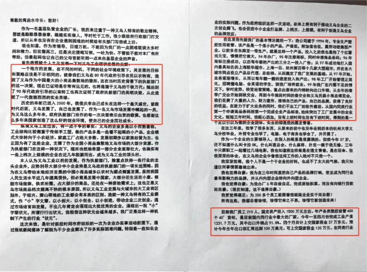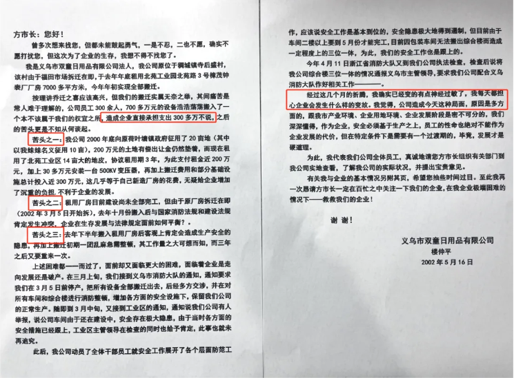 “雙童”被迫搬遷到臨時(shí)租賃的第三代廠(chǎng)房在“走投無(wú)路”的情況下,創(chuàng )始人樓仲平在2002年5月16日第一次向政府發(fā)出兩封求助信!他分別給時(shí)任義烏市市長(cháng)周啟水、主管工業(yè)的副市長(cháng)方浩福寫(xiě)信,詳細介紹了“雙童”的發(fā)展成績(jì)和當下難以為繼的困局,期望政府能夠幫助企業(yè)渡過(guò)難關(guān)!