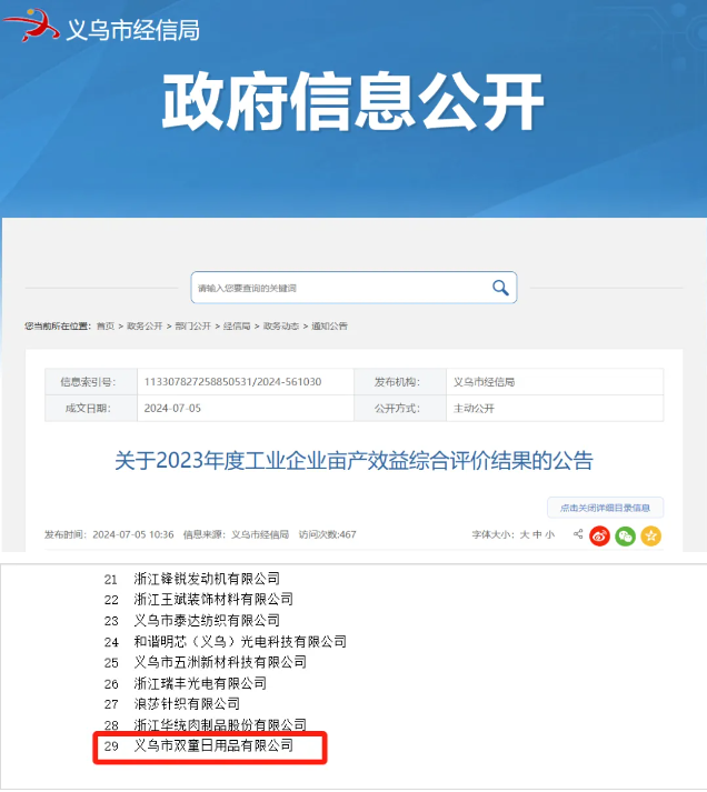 昨日,2023年度義烏工業(yè)企業(yè)畝產(chǎn)效益綜合評價(jià)結果正式出爐,“雙童”再次獲評A類(lèi)企業(yè)!至此,“雙童”已連續11年榮登畝均效益“英雄榜”!