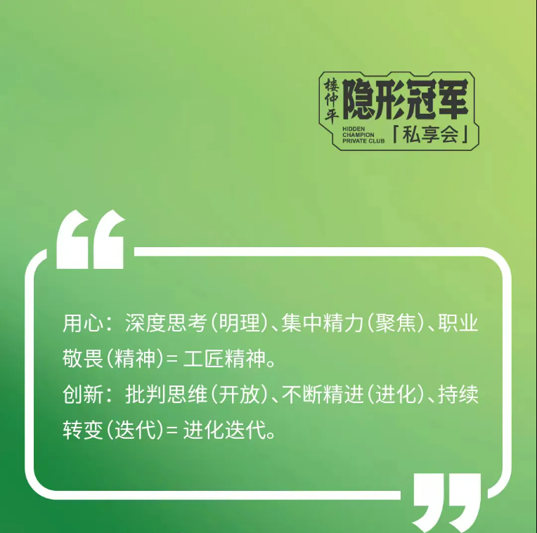 所以企業(yè)永遠沒(méi)有成功、只有成長(cháng)。要成為隱形冠軍企業(yè),就要有做產(chǎn)業(yè)“造鐘者”的自覺(jué),而不是當“報時(shí)人”。