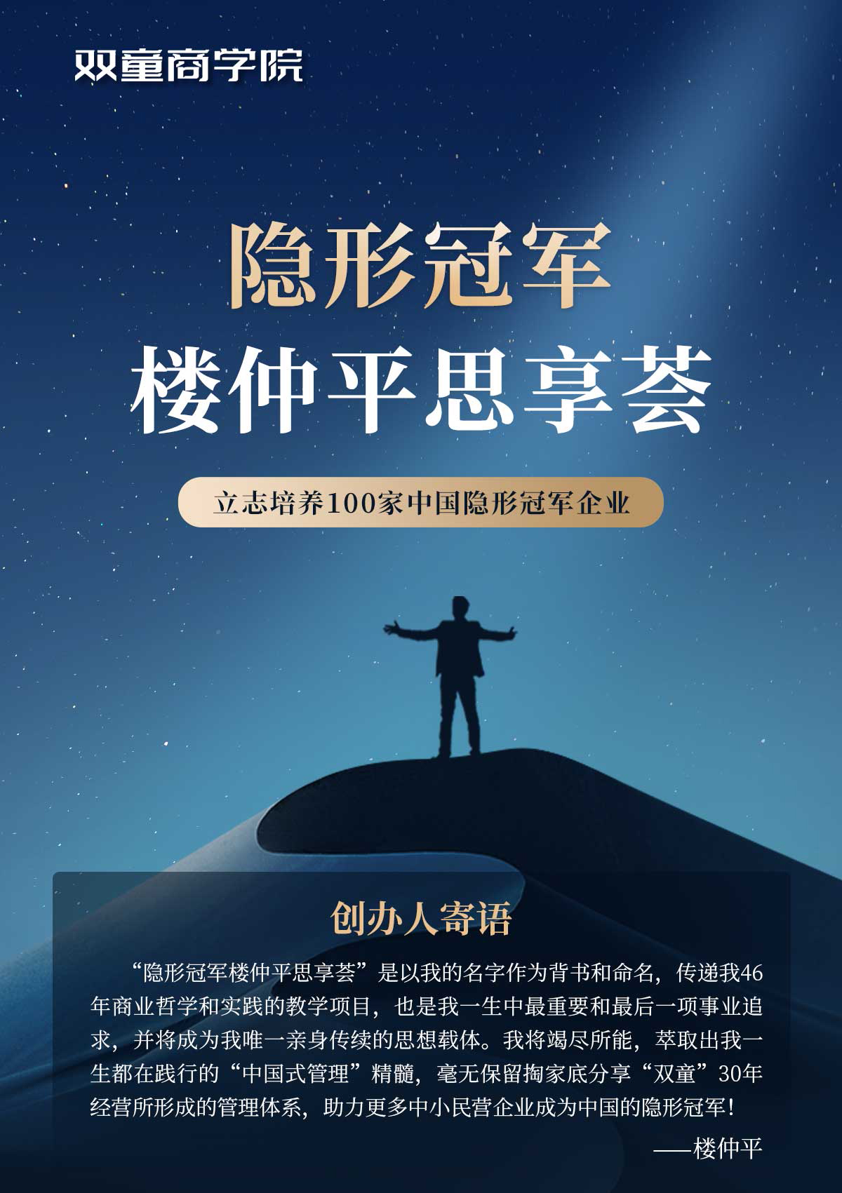 如果你是創(chuàng )業(yè)者、學(xué)習者、思想者,希望在經(jīng)營(yíng)領(lǐng)域有自己的思考和洞察,那么《隱形冠軍樓仲平思享薈》就是為你量身定制,今年最后一期招生,一班只招40位同學(xué),名額所剩不多,抓緊機會(huì )哦!