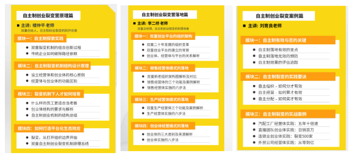 《自主制創(chuàng )業(yè)裂變營(yíng)》是一個(gè)超實(shí)用主義的課程,采用理論+實(shí)踐+案例相結合的方式,讓學(xué)員能夠在3天2夜的學(xué)習中,能夠自主設計一套完整的落地方案!