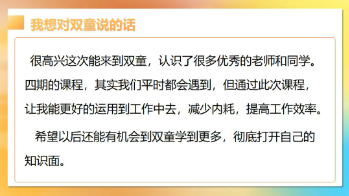 非常感謝有這次學(xué)習成長(cháng)的機會(huì ),我也意識到了身為一個(gè)管理者對企業(yè)的責任。面對企業(yè)現階段閉環(huán)問(wèn)題,我也在積極跟老板探討,我希望能通過(guò)自己能力的提升,讓他們去輕松一些。
