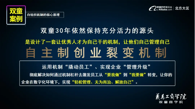 烏卡時(shí)代下,樓仲平意識到數字化只是一種技術(shù)、一個(gè)工具,最終是服務(wù)于人的。它為員工提供工作便利的同時(shí),也讓傳統雇傭關(guān)系面臨瓦解。面對數字化挑戰,“雙童”決定結合多種組織機制和中小企業(yè)的特點(diǎn),自制了一套適用于中小企業(yè)的組織創(chuàng )新制度——自主制創(chuàng )業(yè)裂變機制,讓員工從“要我做”到“我要做”轉變。