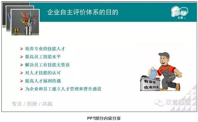 通過(guò)企業(yè)自主評價(jià)體系,員工們可以對照該體系,努力提升自己的技能,解決工作上的難題。而作為公司來(lái)說(shuō),以后在評價(jià)員工的工作技能水平上,將有一個(gè)標準的評判依據,大大有助于對員工的技能培訓,使其“茁壯成長(cháng)”全面提升,留住真正的人才!