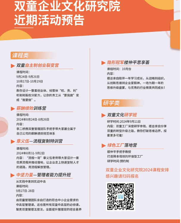 如果你也對“雙童”充滿(mǎn)好奇,也想改變企業(yè)困局現狀,也想要學(xué)習“專(zhuān)精特新”企業(yè)的管理經(jīng)營(yíng)方法,歡迎咨詢(xún)報名“雙童”課程!