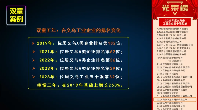 2023年,平臺整體增長(cháng)35.24%;平臺稅收增長(cháng)23.30%,成功登榜“納稅千萬(wàn)元以上工業(yè)企業(yè)”和“義烏市工業(yè)企業(yè)五十強”!
