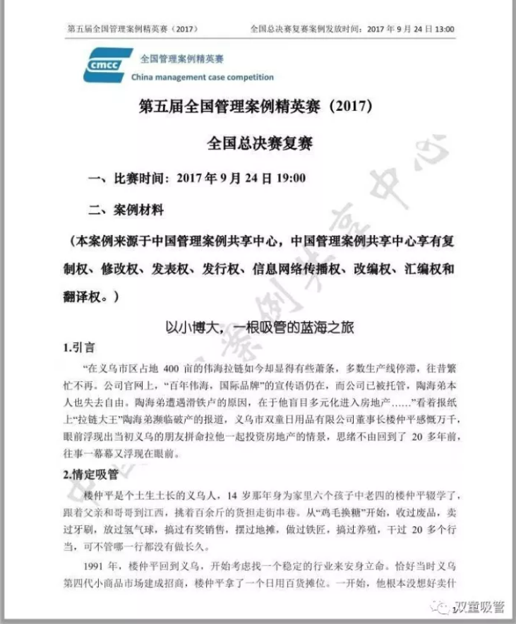 其中浙江工業(yè)大學(xué)和南京大學(xué)采編的管理案例分別被評為2016年和2017年度全國管理案例的百優(yōu)案例。在2017年全國管理案例精英賽中,《以小博大,一根吸管的藍海之旅》被指定為總決賽的PK案例。截至目前,以“雙童”為主題的案例進(jìn)入到國家案例庫的數量就有十多件。