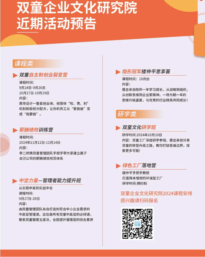 如果你也對“雙童”充滿(mǎn)好奇,也想賦能團隊共同成長(cháng),歡迎走進(jìn)10月10日【雙童文化研學(xué)班】,與上百位優(yōu)秀的創(chuàng )業(yè)者一起學(xué)習!少量名額,歡迎咨詢(xún)鎖定!