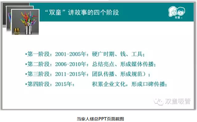 而“雙童”在品牌推廣的過(guò)程中,其實(shí)也是分階段的。從硬廣時(shí)期,每年投入200多萬(wàn)元做廣告,到后來(lái)的塑造差異化亮點(diǎn),引導媒體給“雙童”講故事,再到成立文宣部門(mén),形成團隊“講故事”,最后達到形成企業(yè)文化,形成口碑傳播。這是一條漫長(cháng)的道路,需要“雙童”人持之以恒的堅持和努力!