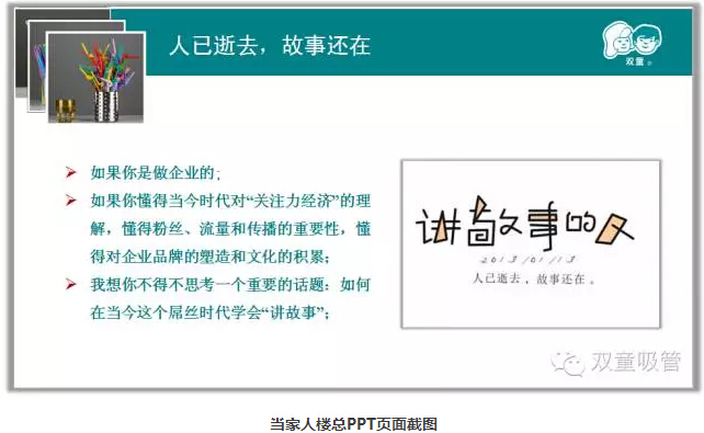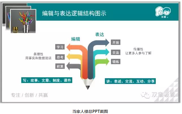在講課過(guò)程中,當家人樓總也重點(diǎn)闡述了他在偉雅老師和指間柔沙老師影響下,培育“雙童”文宣團隊的過(guò)程。從最開(kāi)始的不斷失敗,到手把手把吸管妞帶在身邊培養,再到慢慢形成五人編制的文宣團隊,中間可謂是一波三折。