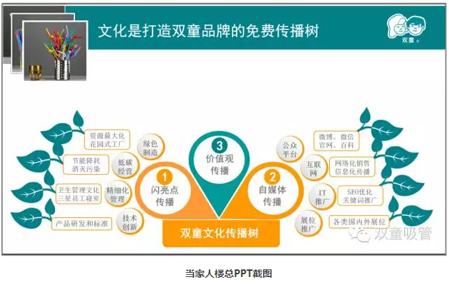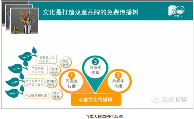 上邊則是政府、媒體關(guān)注的價(jià)值觀(guān)傳播。三大部分組成了“雙童”的文化傳播樹(shù)!而這棵樹(shù)也清晰系統地說(shuō)明了“雙童”是如何傳播“故事”、塑造品牌的!