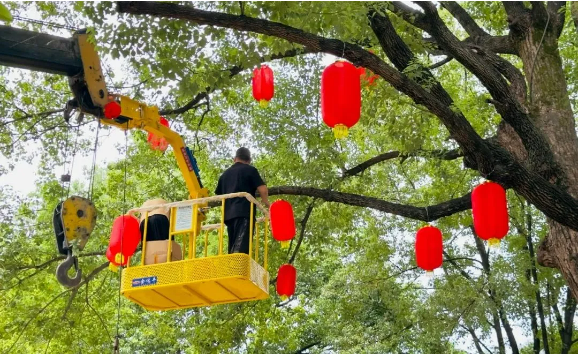 廠(chǎng)區工作人員正在為“雙童”一號樹(shù)掛燈籠