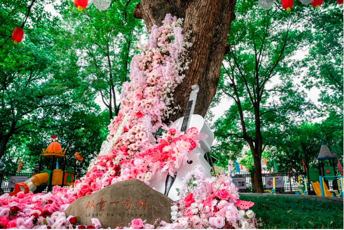 不僅高聳入云的“雙童一號樹(shù)”被裝點(diǎn)得如詩(shī)如畫(huà),就連它腳下的每一寸土地也未能幸免于這場(chǎng)裝飾盛宴。是的你沒(méi)看錯,一號樹(shù)下四位工作人員親自動(dòng)手、群策群力、加班加點(diǎn),將一朵朵花插入一號樹(shù)下打造出了一面唯美的花墻!