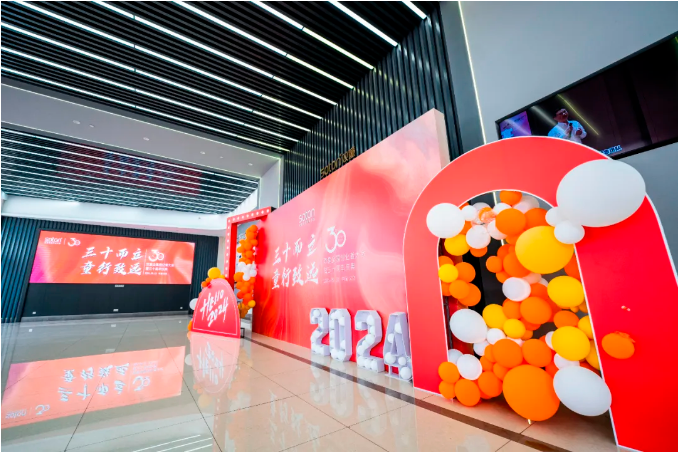 二期廠(chǎng)區內一樓大廳煥然一新~“三十而立,童行致遠”的標語(yǔ)把整個(gè)雙童都霸占啦~而七樓的空中花園,則被裝飾得如同春節一般喜慶,大紅燈籠高高掛起,充滿(mǎn)了30周年濃濃的慶典色彩~