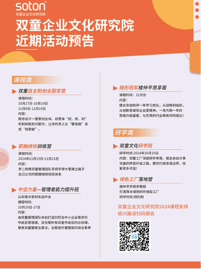 雙童走過(guò)的三十載春秋,是歷經(jīng)風(fēng)雨洗禮、勇往直前的三十年,也是攜手各界伙伴共同成長(cháng)的三十年。這三十年的輝煌成就,深深植根于每一位員工的辛勤付出,得益于每一位客戶(hù)的信賴(lài)與扶持,更離不開(kāi)近年來(lái)眾多商學(xué)院學(xué)員的并肩同行!