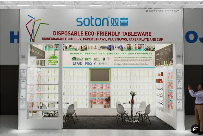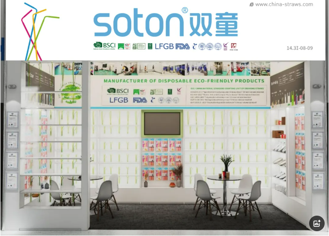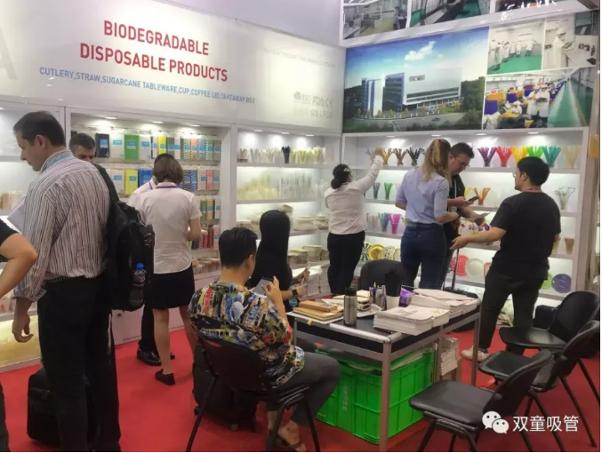 雙童日用品本次參展以推廣可降解產(chǎn)品為主:PLA吸管、紙吸管、可降解膜袋類(lèi)、創(chuàng )新吸管、塑料口杯、PE手套、垃圾袋、塑料吸管、不銹鋼吸管、玻璃吸管、竹子吸管等。