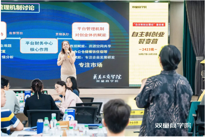 為了確保學(xué)員們在落地過(guò)程中,有效平衡創(chuàng )業(yè)體和平臺之間的財務(wù)管理問(wèn)題,還特別邀請了雙童創(chuàng )業(yè)共享平臺第十四創(chuàng )業(yè)體總經(jīng)理蔣秀芳分享雙童的操作管理經(jīng)驗。