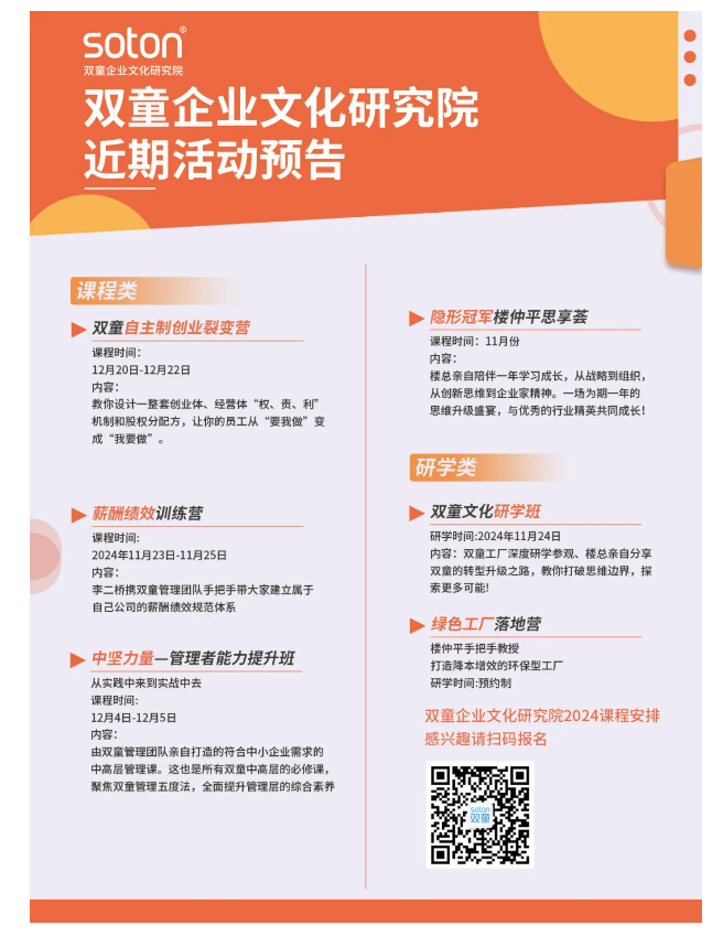 首先雙童經(jīng)過(guò)30年的發(fā)展,經(jīng)歷了粗放經(jīng)營(yíng)的“原始積累”階段,做強做大的“快速發(fā)展”階段、“專(zhuān)精特新”轉型和創(chuàng )新階段,深知中小企業(yè)各個(gè)階段的痛點(diǎn),還是首個(gè)“彼得·德魯克中國管理獎”的中小企業(yè)獲得者,雙童的經(jīng)營(yíng)理念和管理體系能夠幫助更多中小企業(yè)少走彎路、少踩坑!