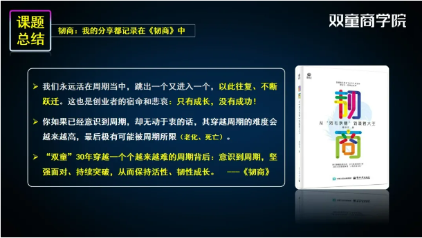 雙童30年穿越一個(gè)個(gè)越來(lái)越難的周期背后,是創(chuàng )始人樓仲平在周期來(lái)臨之前,就意識到了新周期,然后帶領(lǐng)企業(yè)堅強面對、持續突破,從而讓雙童保持活性、韌性成長(cháng)!所以在分享的最后,樓總再次勸誡各位創(chuàng )業(yè)者:我們永遠活在周期當中,跳出一個(gè)又進(jìn)入一個(gè),以此往復、不斷躍遷。如果你已經(jīng)意識到周期,卻無(wú)動(dòng)于衷的話(huà),其穿越周期的難度會(huì )越來(lái)越高,最后極有可能被周期所限(老化、死亡)!