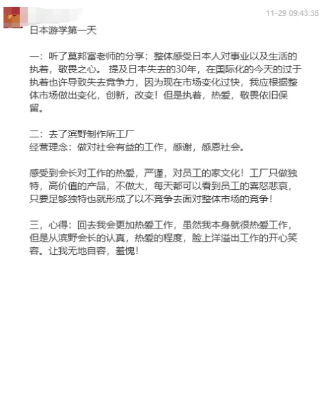 對于企業(yè)研學(xué)要學(xué)什么,他也提出了自己的建議:“看無(wú)形、觀(guān)無(wú)形”。比起硬件設施,在企業(yè)管理上學(xué)習日本企業(yè)的匠心精神和落地精益管理理念才更有長(cháng)期價(jià)值!這也讓同學(xué)們更明確了在接下來(lái)的入企研學(xué)中要怎么看,看什么。