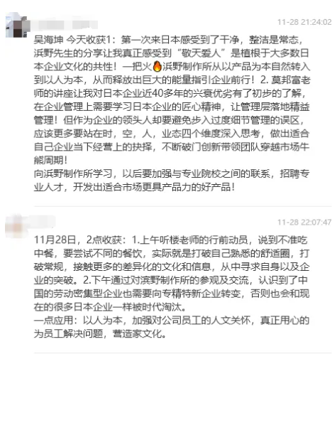 所以,在第一天的研學(xué)結束之后,同學(xué)們不僅收獲了很多關(guān)于產(chǎn)品創(chuàng )新、精細化管理等企業(yè)經(jīng)營(yíng)的新靈感,對自身企業(yè)未來(lái)的經(jīng)營(yíng)方向也有了不一樣的感觸: