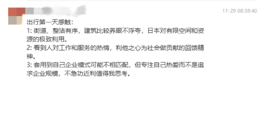 在第二期“弟子班”第一模塊《開(kāi)啟創(chuàng )業(yè)者成長(cháng)之門(mén)》中,樓老師曾反復影響同學(xué)們:拿著(zhù)舊地圖找不到新大陸,這個(gè)世界并非經(jīng)驗積累的產(chǎn)物,而是通過(guò)“顛覆性破壞”創(chuàng )造的全新世界。所以,創(chuàng )業(yè)者思維“開(kāi)門(mén)”至關(guān)重要,思維方式指導著(zhù)創(chuàng )業(yè)者的行為!而本次日本冠軍之旅游學(xué),正是開(kāi)啟新視野、實(shí)現思維“破局”的有效途徑之一。