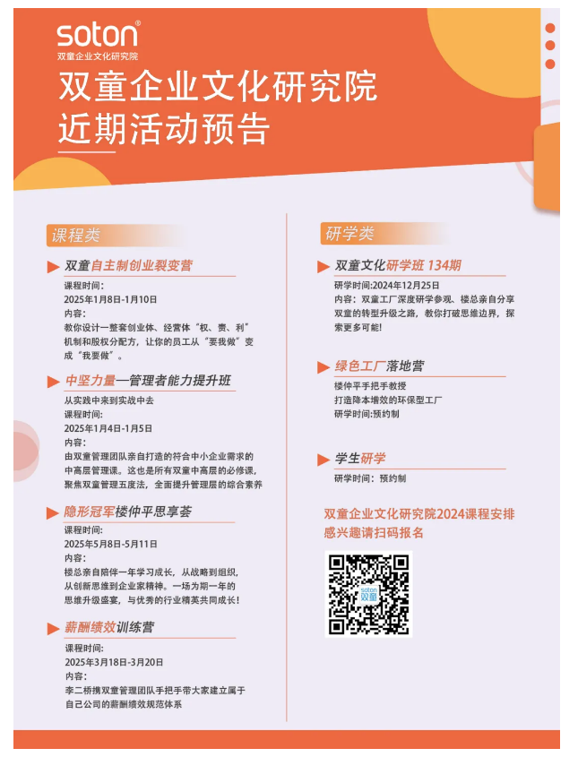 如果你也對“雙童”充滿(mǎn)好奇,也想賦能團隊共同成長(cháng),歡迎走進(jìn)12月25日走進(jìn)第134期【雙童文化研學(xué)班】,與上百位優(yōu)秀的創(chuàng )業(yè)者一起學(xué)習!