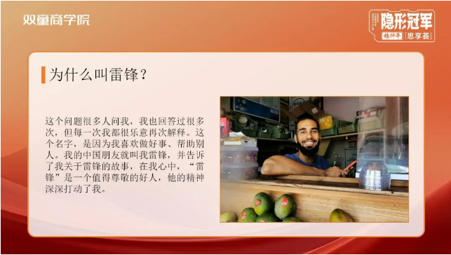 追溯“雷鋒”這個(gè)名字的由來(lái),背后還藏著(zhù)一段饒有趣味的故事:2015年,他跟隨兩位舅舅來(lái)到中國義烏,利用語(yǔ)言?xún)?yōu)勢進(jìn)入一家外貿企業(yè)任職,主要負責倉庫裝貨與發(fā)貨等環(huán)節。初入職場(chǎng)時(shí),天生樂(lè )于助人的他,無(wú)論對方是否相識,總是愿意伸出援手,即便是提供些微的幫助。于是,領(lǐng)導同事們開(kāi)始戲稱(chēng)他為“埃及雷鋒”。