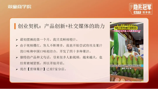 雷鋒老師告訴同學(xué)們,截至目前,“雷鋒果汁”已成功開(kāi)設了七家分店,且其業(yè)務(wù)持續繁榮的背后,主要得益于四大核心推動(dòng)因素: