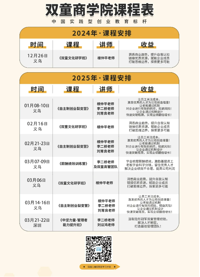 如果你也對“雙童”充滿(mǎn)好奇,也想賦能團隊共同成長(cháng),歡迎走進(jìn)12月26日【雙童文化研學(xué)班】,與上百位優(yōu)秀的創(chuàng )業(yè)者一起學(xué)習,也是年前最后一期,抓住機會(huì )哦!
