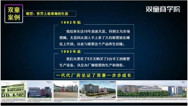 此后不到六年,雙童創(chuàng )業(yè)平臺成功孵化出了16家創(chuàng )業(yè)體和26個(gè)經(jīng)營(yíng)體,并創(chuàng )造了3.6倍的業(yè)績(jì)增長(cháng)!形成了以吸管制造業(yè)為基礎,以國際貿易和創(chuàng )業(yè)教育兩大板塊為融合的新型產(chǎn)業(yè)模式,完成了從“一根吸管”到“創(chuàng )業(yè)平臺”的轉變!