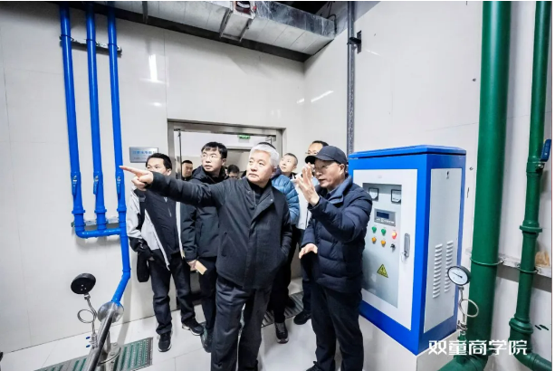 為了讓大家弄清楚各個(gè)系統的運行原理,創(chuàng )始人樓仲平首先陪同張維迎教授和辛莊課堂同學(xué)們來(lái)到“一號樹(shù)”下,了解廢水處理中水回用系統。這套系統可以將員工生活廢水的70%進(jìn)行二次利用,每年能幫雙童節省近50萬(wàn)元的水費。
