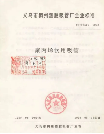 雙童的第一件企業(yè)標準是在1998年4月30日發(fā)布的,也是中國的第一份吸管標準。那時(shí)候義烏的小商品普遍以低、小、散、弱為特點(diǎn),但是雙童沒(méi)有隨波逐流,堅持走標準化之路,后來(lái)又做了產(chǎn)業(yè)標準、地方標準、國家標準,包括國際標準。雙童第一件企業(yè)標準,目前已被義烏市博物館收藏展出