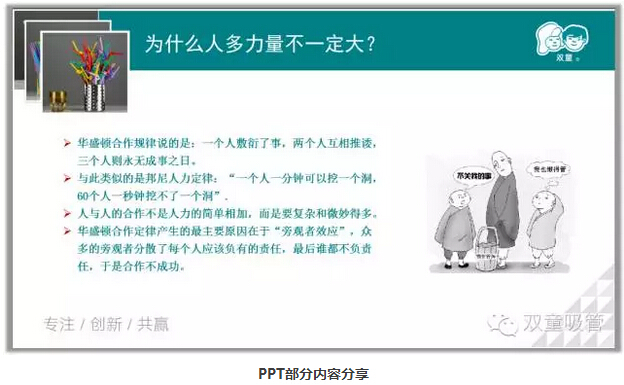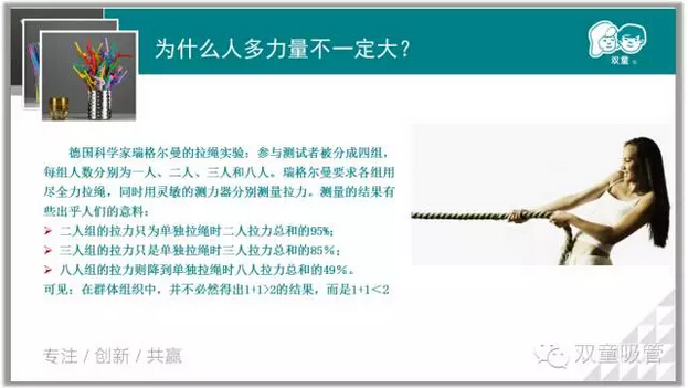 為什么人多不一定力量大呢? 德國科學(xué)家瑞格爾曼的拉繩實(shí)驗:參與測試者被分成四組,每組人數不同。測量的結果顯示人越多,反而拉力總和越小??梢?jiàn):在群體組織中,并不必然得出1+1>2的結果,而是1+1<2。這也是旁觀(guān)者效應,一個(gè)人敷衍了事,兩個(gè)人互相推諉,三個(gè)人則永無(wú)成事之日。也就有了三個(gè)和尚沒(méi)水喝的故事!