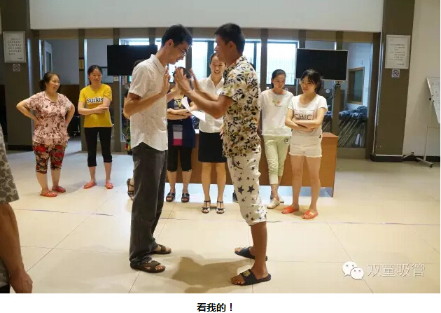 “太極推推樂(lè )?”這個(gè)游戲是讓每組夫妻派出一人應戰。對抗的兩人面對面站立,雙方相互之間輕推對方的手掌,對方的腳最先離開(kāi)原來(lái)站立的點(diǎn),誰(shuí)就輸了??炜?!我們的妻子們可賣(mài)力啦,丈夫們也毫不示弱,場(chǎng)面可真是熱鬧呀!