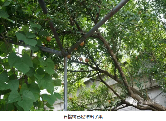 一旁石榴樹(shù)也來(lái)湊熱鬧!因為有著(zhù)1.5米厚的土層滋養,樓頂的這一株石榴樹(shù)也長(cháng)出了果實(shí),再過(guò)不久,“雙童”的吃貨們又有???!