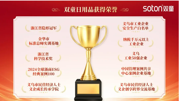 在充滿(mǎn)挑戰的2024年里,雙童還獲得了浙江省隱形冠軍、義烏市工業(yè)企業(yè)安全生產(chǎn)白名單、金華市標準總師實(shí)訓基地、浙江省科學(xué)技術(shù)進(jìn)步獎、義烏工業(yè)50強企業(yè)、納稅千萬(wàn)以上工業(yè)企業(yè)......