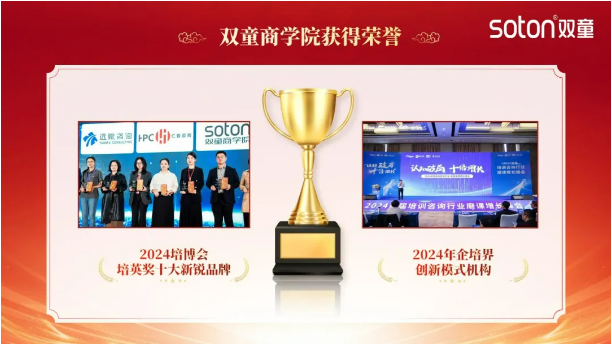 除此之外,雙童第五創(chuàng )業(yè)體——雙童商學(xué)院,榮獲2024年培博會(huì )培英獎的“十大新銳品牌”稱(chēng)號,并被評選為“2024年企培界創(chuàng )新模式機構”。作為一個(gè)新興的創(chuàng )業(yè)團隊,能在培博會(huì )——這個(gè)中國教育界規格最高且匯聚全國教育機構的盛會(huì )中贏(yíng)得認可實(shí)屬不易。