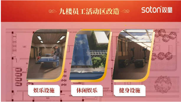 雙童非常重視“家文化”和德魯克的順人性管理理念,所以創(chuàng )始人樓仲平堅持認為“工廠(chǎng)不是冷冰冰的掙錢(qián)機器”,并一直致力于為員工打造一個(gè)社區工廠(chǎng)。在分享的尾聲,李總向大家介紹了雙童的新項目。為了讓這個(gè)工廠(chǎng)變得更加“有趣”,更受年輕人喜歡,老廠(chǎng)9樓將增設娛樂(lè )設施、健身設施以及抓娃娃機等設備,確保每位員工都能享受到這份樂(lè )趣。