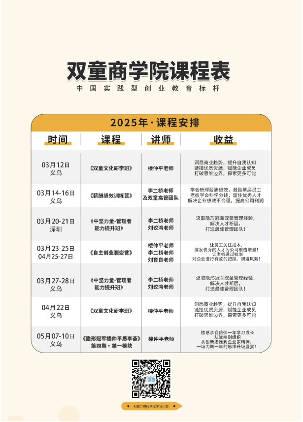 在此期間,創(chuàng )始人樓仲平伏案三年,將該機制進(jìn)行系統編輯成了30萬(wàn)余字的《自主創(chuàng )業(yè)裂變營(yíng)》教材,自主創(chuàng )業(yè)裂變機制也被打磨成了一個(gè)非常成熟的課程,通過(guò)雙童商學(xué)院的講臺惠及了來(lái)自全國各地2700+中小企業(yè)!