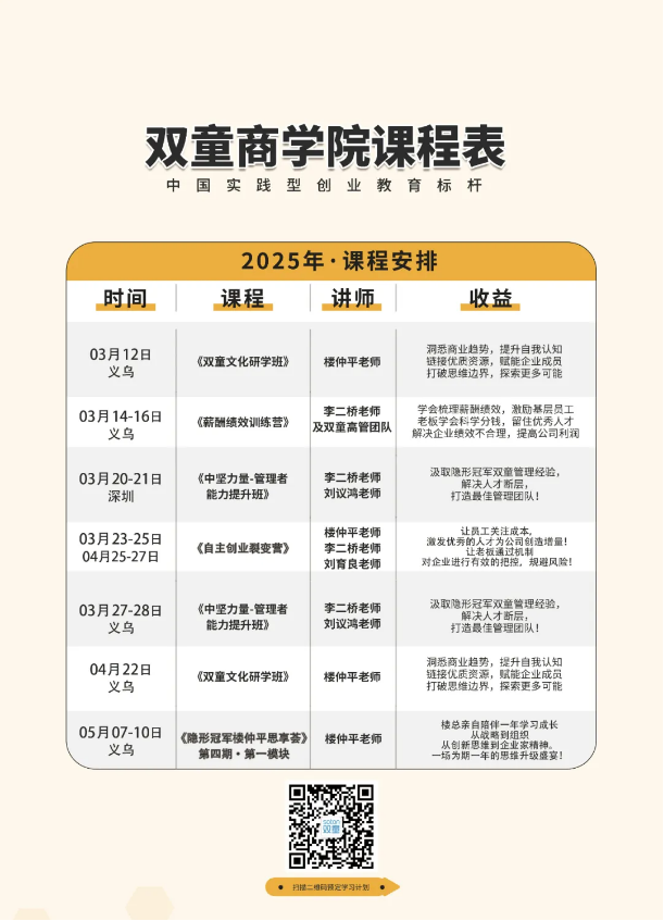 如果你也對“雙童”充滿(mǎn)好奇,也想全面了解“雙童”的企業(yè)文化、經(jīng)營(yíng)理念、精細化管理,通過(guò)系統的課程深入地探索、學(xué)習“雙童”成為行業(yè)“隱形冠軍”的底層邏輯,從而賦能自己的企業(yè),歡迎咨詢(xún)報名“雙童”課程!