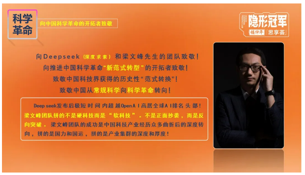 課程一開(kāi)始,樓老師首先致敬了Deepseek(深度求索)和梁文峰團隊,并以其在極短時(shí)間內迅速崛起,成為全球AI頭部為案例,不僅讓大家看到了在持續開(kāi)放的產(chǎn)業(yè)政策下,中國科技界突破西方技術(shù)圍堵獲得的歷史性 “范式轉換”,也讓大家意識到,中國經(jīng)濟正逐漸從“機會(huì )套利” 中走出,正從“套利型經(jīng)濟結構” 向“創(chuàng )新性經(jīng)濟結構”轉型。