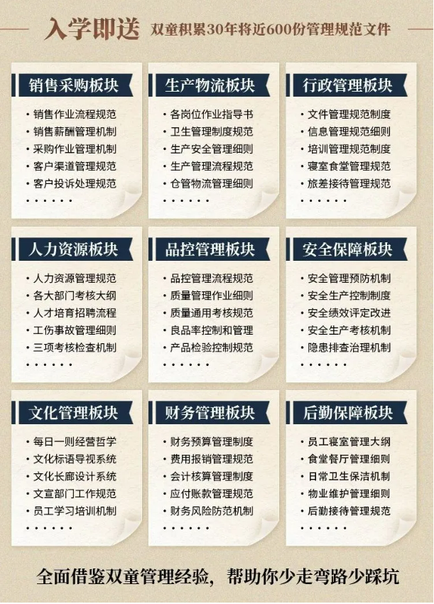 所以,入學(xué)“隱形冠軍樓仲平思享薈”之后,項目組會(huì )將“雙童”積累了31年、包含了銷(xiāo)售、生產(chǎn)、行政、人力資源、品質(zhì)、安全、文化管理、財務(wù)和后勤等9大板塊,近600份管理規范文件,全部打包給學(xué)員,幫助學(xué)員企業(yè)能夠全面借鑒雙童管理經(jīng)驗、少走彎路、少踩坑!
