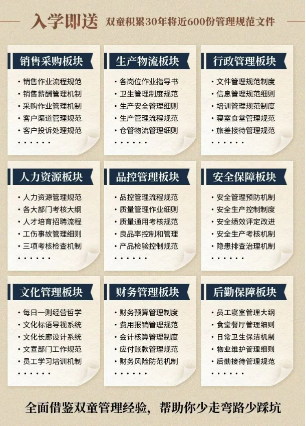 所以,入學(xué)“隱形冠軍樓仲平思享薈”之后,項目組會(huì )將“雙童”積累了31年、包含了銷(xiāo)售、生產(chǎn)、行政、人力資源、品質(zhì)、安全、文化管理、財務(wù)和后勤等9大板塊,近600份管理規范文件,全部打包給學(xué)員,幫助學(xué)員企業(yè)能夠全面借鑒雙童管理經(jīng)驗、少走彎路、少踩坑!