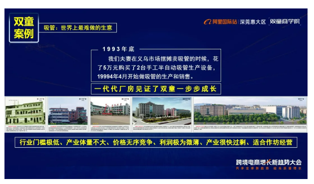 此后七年,雙童創(chuàng )業(yè)平臺成功孵化出了16家創(chuàng )業(yè)體和26個(gè)經(jīng)營(yíng)體!形成了以吸管制造業(yè)為基礎,以國際貿易和創(chuàng )業(yè)教育兩大板塊為融合的新型產(chǎn)業(yè)模式,完成了從“一根吸管”到“創(chuàng )業(yè)平臺”的轉變!