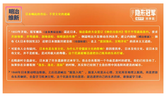 樓老師在課上引用的歷史案例都有力證明了這點(diǎn):乾隆皇帝要求英使行“跪拜禮”并拒絕雙方互通貿易和咸豐皇帝因外交禮儀沖突激化矛盾,成為導致“火燒圓明園”的導火索,封建統治者的固執讓中國與近代文明的世界慢慢脫軌;而日本面臨同樣境遇時(shí),因未受文化的遮蔽,通過(guò)“明治維新”,快速走上了資本主義道路;包括今天義烏的成就,也是義烏商人主動(dòng)打破了文化遮蔽,通過(guò)“雞毛換糖”才闖出了全球小商品之都!
