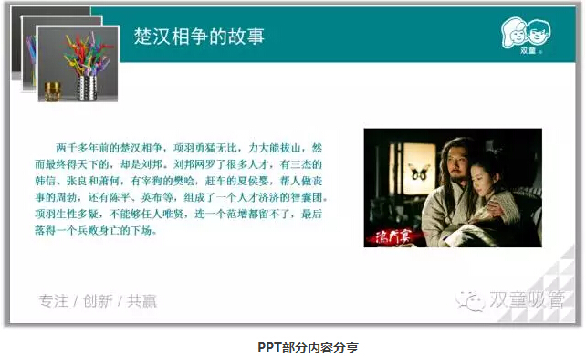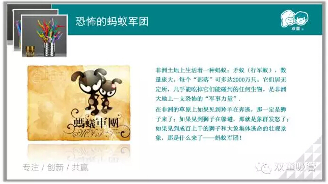 在進(jìn)行了游戲互動(dòng)之后,我們的課程也正式開(kāi)始啦!何為團隊力量?接下來(lái)吸管妞通過(guò)恐怖的螞蟻軍團和楚漢相爭的兩個(gè)小故事和我們講解了團隊的力量。與伙伴精誠協(xié)作,才能變得更強大。