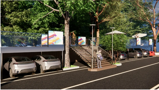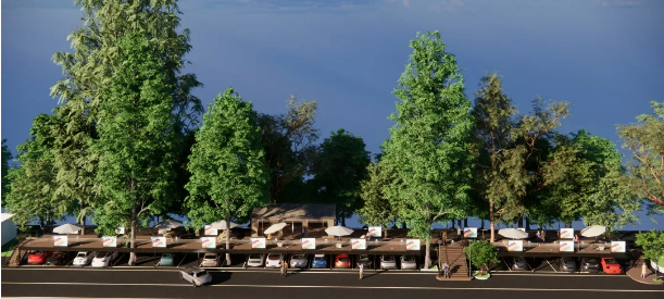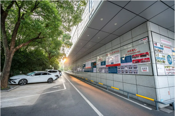 雙童的百米文化長(cháng)廊對面正是一片樹(shù)林和停車(chē)場(chǎng),只需要設計一個(gè)懸空走廊,既保住了原有的樹(shù)木,還留住了停車(chē)場(chǎng)地,又可以有一塊新的員工休閑區,三全其美!