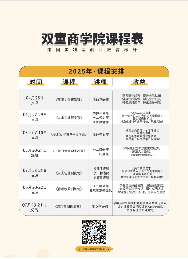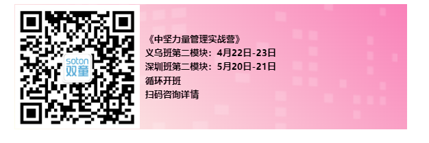 各位中小企業(yè)老板們,如果你也想把自己從大小瑣事中解放出來(lái),也想要一支有活力、強要性的管理團隊,該課程學(xué)制為三個(gè)模塊完成交付后贈送一次樓仲平年度大課。義烏班第二模塊4月22日-23日,深圳班第二模塊5月20日-21日,循環(huán)開(kāi)班。歡迎到雙童商學(xué)院參加學(xué)習!