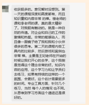 兩天的課程學(xué)習之后,我們也收到了不少本期學(xué)員的好評反饋:在學(xué)習完這門(mén)課程后都給出了好評雙童商學(xué)院選擇走出義烏在深圳開(kāi)設《中堅力量管理實(shí)戰營(yíng)》課程,絕非偶然的市場(chǎng)選擇,而是通過(guò)深思熟慮與企業(yè)發(fā)展剛需的戰略布局。